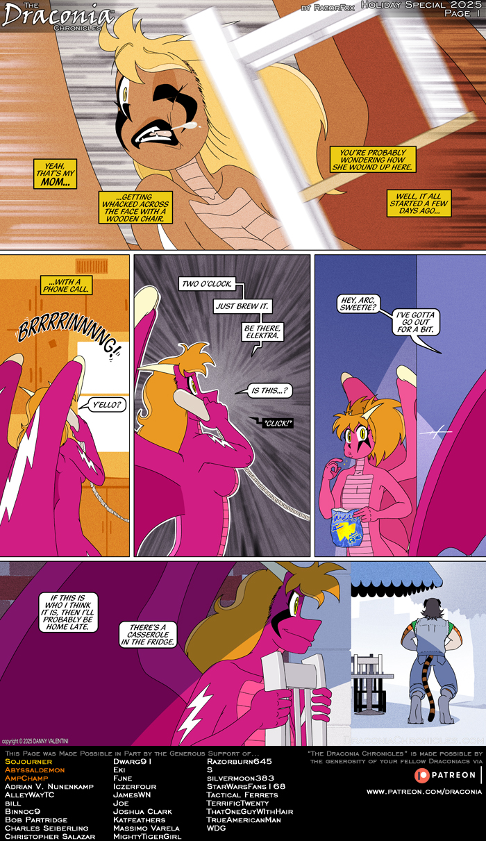 Howdy, fellow Draconiacs! RazorFox here, and welcome to this year’s Draconia Chronicles Holiday Special! What’s in store for Elektra‘s impromptu rendezvous with her longtime rival Scyde? Stay tuned…